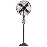 Deco breeze prestige rustica floor standing fan. 16-inch fan head. Decorative and functional oscillating fan with a whisper-quiet 45 watt motor. Three-speeds - low speed is 900 rpm; the medium speed is 1100 rpm; the high speed is 1280 rpm.