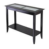 Uniting quality materials with graceful design, this hall table by makes a welcome décor update. A member of the Syrah series, the table is crafted of solid wood with a deep Espresso finish and side-by-side frosted glass panels set into the roomy top. An open shelf below adds display and storage space, while tapered legs keep the look light and airy. This versatile piece measures 40 inches long by 16.3 inches wide by 30 inches high and looks wonderful alone or with the matching coffee, end, and accent tables. Assembly is required; all tools and hardware are included.