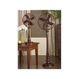 For long-lasting beauty with retro styling, this 16-inch floor-standing fan features durable wood and polyresin construction, a neck resembling a twisted baguette, and an elegantly detailed round-shaped base. The unit provides a whisper-quiet 45-watt motor and four fan blades for cooling relief in the summer or effective air circulation all year long. Choose from three different speed settings, low at 900 RPM, medium at 1100 RPM, or high at 1280 RPM. In addition, the fan's horizontal oscillation of 135 degrees keeps air moving throughout the room, plus it can be tilted vertically by up to 10 degrees to ensure the proper angle. Other highlights include a traditional round shape, a user-friendly control knob, simple assembly, and an easy-to-clean design. Ideal for the living room, office, or bedroom, the floor-standing fan measures approximately 12 by 17 by 54 inches and carries a one-year limited warranty.