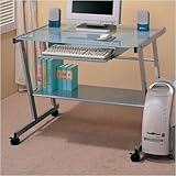 Modern Silver Finish Metal Computer Station Desk Table w/Glass TopThis is a brand new modern computer station in silver finish with frosted glass top, it features pull out keyboard tray, a shelf under the table top creating an excellent area for printer or scanner.There is a shelf on the left side of the table which is for your CPU. Item is designed to be practical in use to beautify your home decor.Item requires simple assembly. Dimension: 37"W 23-5/8"D 29-1/2"H