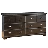 Featuring bold, clean lines and a luxurious dark ebony finish, this roomy dresser lends a sense of distinctive organization to any bedroom, den, or guest room. The unit's durable engineered-wood construction stands up to everyday wear and tear, while its rich surface and decorative kickplate-style base offer a classic beauty that blends gracefully with any decor or color scheme. The double dresser provides six large drawers that work great for storing folded clothing, blankets, games, and more, keeping items easily accessible yet hidden from view. Equipped with authentic metal shoe-cap handles, each drawer glides smoothly and catches with a child-safe latch for security, plus the upper two drawers display a grooved design that gives the illusion of double drawers. Best of all, the dresser's top rim curves gently with contoured edges that protect against injury, making it a smart and safe choice for children's bedrooms, playrooms, or guest rooms at Grandma's house. Standing alone or paired with matching pieces from the Mountain Lodge Collection, the unit serves as a handsome addition to any home. Fully assembled, the dresser measures 16 by 60 by 31 inches and carries a five-year warranty.